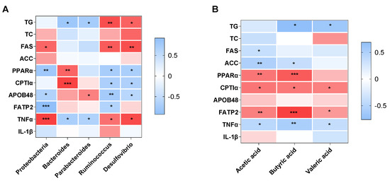 Heatmap of the correlation analysis of the altered gut microbiota (A) and SCFAs levels (B) with the NAFLD-related parameters in offspring mice. * p < 0.05, ** p < 0.01 and *** p < 0.001 represent a significant correlation. Abbreviation: TG, triglyceride; TC, total cholesterol.