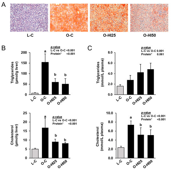 ORO-stained liver sections (A), triglyceride and cholesterol concentrations in liver (B) and plasma (C) of the rats. (A) Images are shown for one animal per group. (B,C) Bars represent means ± SD for n = 10 rats/group. * Effect of the protein source (C vs. HI25 vs. HI50) within the obese groups: a,b Bars without a common letter differ across the obese groups, p < 0.05.