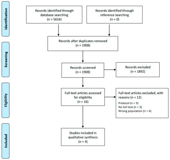 The initial search yielded 5616 records, of which 3708 were removed as duplicates. Of the total 1908 articles, after the title and abstract and the full-text review, four met our inclusion criteria (Figure 1). A comprehensive list of the excluded studies with their corresponding justification can be found in Supplementary Materials (Table S3).