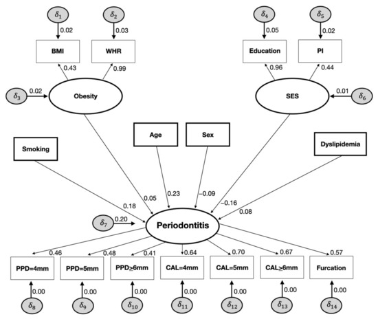 SEM also allows estimating latent variables that are non-observable variables (represented by ellipses in the figures) deduced from the correlation among indicator variables, representing a shared variance of the phenomena to reduce measurement errors [22]. In our theoretical model, the variables SES (socioeconomic status deduced from the correlation between education and poverty index), obesity (inferred from the correlation between BMI and waist-to-hip ratio), and periodontitis (deduced from the correlation between the number of surfaces with PPD = 4 mm, PPD = 5 mm, PPD ≥ 6 mm, CAL = 4 mm, CAL = 5 mm, CAL ≥ 6 mm, and the number of teeth with furcation involvement) were considered as latent variables.