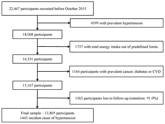 We assessed 22,467 participants recruited before October 2015, to ensure they had completed at least the two-year follow-up questionnaire; 4399 participants were excluded because of prevalent HT (self-reported diagnosis of HT in the baseline questionnaire, systolic blood pressure (SBP) > 130 mmHg or diastolic blood pressure (DBP) > 80 mmHg or on antihypertensive treatment); 1737 participants reported total daily energy intake outside of predefined limits (<800 or >4000 Kcal/day for males, and <500 or >3500 Kcal/day for females) [18] and were excluded. Additionally, 1164 participants were excluded due to previous diagnosis of chronic diseases (cancer, diabetes or cardiovascular diseases such as myocardial infarction, stroke, revascularization procedures, valvular pathology, implanted pacemaker, or heart transplant previous to baseline). Out of the remaining 15,167 participants, 1362 were lost to follow-up (retention in the cohort: 91.0%), resulting in a final sample of 13,805 participants (Figure 1).