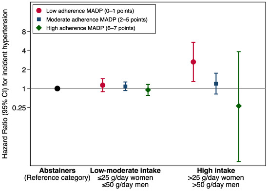 According to our results, moderately drinking alcohol while maintaining the features of a high adherence to the MADP was associated with a lower risk of HT compared with departures from this drinking pattern. However, another aspect that deserves attention is alcohol abstinence. The comparison with abstainers is controversial due to some special characteristics of this group and the possibility of being former drinkers [54]. In our study, we used the participants with a high adherence to the MADP as reference category and therefore, the potential bias would only affect to the estimation corresponding to the abstainers group. Thus, we did not observe significant differences between abstainers and drinkers who adhered to the MADP regarding HT risk. More studies are needed to support this null association.