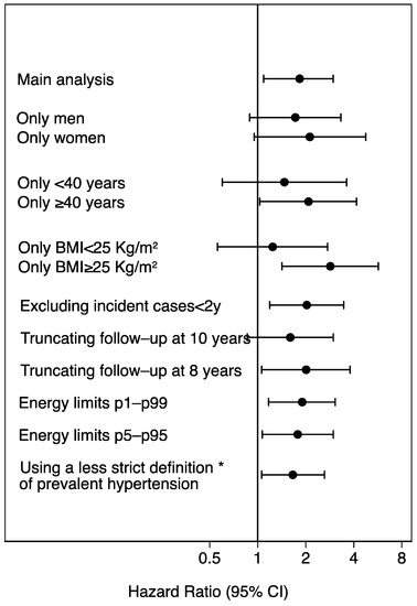 Finally, we refitted the main analysis under different scenarios to test the robustness of the results: (a) assessing only incident cases after 2 years of follow-up (left-truncating follow-up at 2 years); (b) excluding late incident cases of HT: (b1) right-truncating follow-up at 10 years; (b2) right-truncating follow-up at 8 years; (c) changing allowed limits for total energy intake: (c1) to percentiles 1st and 99th; (c2) to percentiles 5th and 95th; (d) using a less strict definition of prevalent HT (including in the study participants with baseline systolic blood pressure between 130 and 139, or diastolic blood pressure between 80 and 89 mmHg). Moreover, we conducted subgroup analysis stratifying the sample according to sex, BMI (<25/≥25 kg/m2), and age (<40/≥40y).