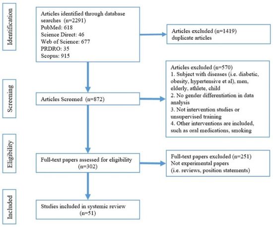Arterial stiffness is an unavoidable physiological process. It is difficult to determine which factors contribute to the progression of arterial stiffness. Therefore, the current interventions for arterial stiffness suffer from a lack of targeting. This may be the reason why medical treatment for the progression of arterial stiffness is modestly effective [3]. In fact, specific populations, such as young women, middle-aged women, and older women, have specific factors associated with arterial stiffness. Oestrogen is thought to play an important role in the female-specific changes in arterial stiffness [9]. In adult women, overall oestrogen levels reach a peak in the late 20s. Then oestrogen levels begin to decline at 30 years of age until menopause. Menopause is a milestone in female ageing- it means that oestrogen levels will remain at low levels [11]. Under this premise, young women are in a period of oestrogen upswing, middle-aged women are mainly in a period of oestrogen downturn, and older women are in a period of low oestrogen levels. Oestrogen could reduce arterial stiffness through increased nitric oxide (NO) [12]. In addition, norepinephrine, which can drive vascular smooth cell (VSMC) contraction, is positively correlated with age in women [13]. VSMCs are most abundant cell types in vessel walls and have emerged as key players in arterial stiffness [14]. Furthermore, the advanced glycation end product (AGE) accumulation hastens multisystem functional decline with age [15]. AGEs are a non-enzymatic process involving glycation of sugars or reactive oxoaldehyde with proteins, lipids, or nucleic acids. AGEs promote arterial stiffness through the upregulation of inflammation and collagen cross-linking [16], which, in turn, leads to endothelial dysfunction and subsequently increases vascular stiffness. Exercise can modulate these etiological factors and, thus, improve arterial stiffness. However, due to the different characteristics of these etiological factors in women of different ages, it is possible that similar exercise prescriptions may have different effects on arterial stiffness. Incidentally, there are studies that have tentatively confirmed this speculation. For example, an incremental exercise program to exhaustion using Bruce protocol does not modify arterial stiffness in young women [17] but increases arterial stiffness in middle-aged women [18]. In addition, resistance training at 80% 1-RM showed positive effects on arterial stiffness in young women [19] but no change in arterial stiffness in middle-aged and older women [20,21]. Considering the etiological factors and impact of exercise (types, intensity, and frequency), however, to date, no review has been conducted on the effects of exercise on arterial stiffness in healthy young, middle-aged, and older women.