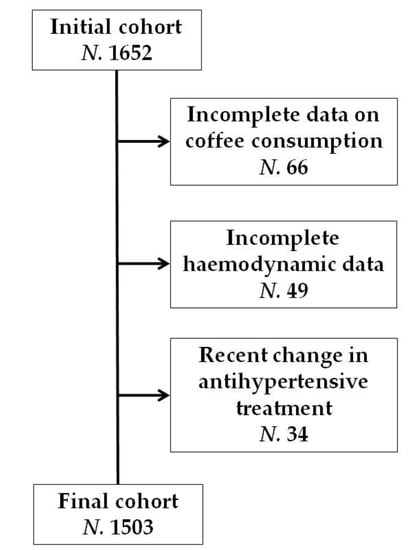During the last BHS population survey, we consecutively evaluated 1652 adult volunteers (Female: 53.4%). From the initial population, 66 participants were excluded due to incomplete information associated with coffee consumption. Individuals with incomplete hemodynamic data (N. 49) were subsequently excluded. Lastly, those who had recently switched antihypertensive medications at the time of the visit (N. 34) were excluded from the analysis (Figure 1).