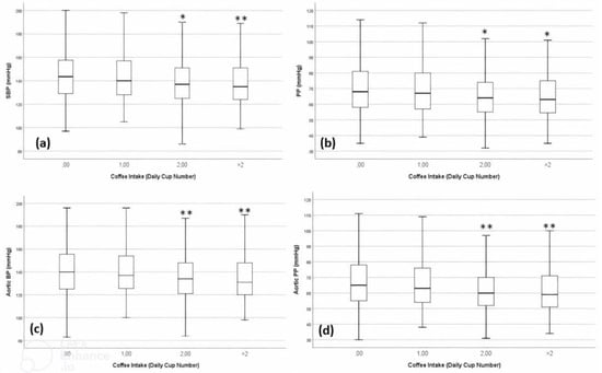Distribution of (a) systolic blood pressure (SBP), (b) pulse pressure (PP), (c) aortic BP and (d) aortic PP in the BHS by coffee consumption (* p < 0.05 vs. no coffee intake, ** p < 0.05 vs. no coffee and 1 coffee cup intake).