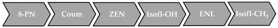 Moreover, only compounds with an estrogenic effect possibly observed in humans at plausible exposure are taken into account. This means that the present review deals with the prenyl-flavanone 8-prenylnaringenin and its precursor isoxanthohumol, coumestrol, the resorcylic acid lactones zearalenol and zearalenone, hydroxylated isoflavones genistein, daidzein, glycitein, the metabolite equol, and the enterolignans enterodiol and enterolactone. Finally, this review also concerns the methoxylated isoflavones that can be hydrolyzed into hydroxylated parent compounds. See Figure 1 for the structures of these main compounds and Figure 3 for their in vitro estrogenic potencies, sorted from the highest to the lowest.