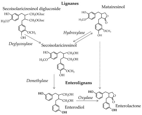 Still, in humans, the enterolignans enterolactone and enterodiol are produced by specific bacteria clusters that are not present in all consumers. However, in [31], the Tmax for enterolactone was found to be observed at 24–36 h post-ingestion, while it was observed at 12 to 24 h post-ingestion for enterodiol. Such a large Tmax is explained by the gut-bacterial origin of both compounds and allows for the accumulation of both in blood, reaching a steady-state level during chronic ingestion periods. As a consequence, the level of enterolactone in human consumers’ serum and urine can vary widely, being potentially in the same range and even higher than the concentration of isoflavones, i.e., between 0.03 to 1 µM in plasma. For instance, in [80] the median serum–enterolactone concentration was 13.8 nM (range: 0–0.0956 µM) and 16.6 nM (range: 0–0.182.6 µM) in men and women, respectively. The conversion, which can be seen in Figure 5, is the metabolism of seccoisolariciresinol diglucoside into enterolactone. It is most-studied conversion thus far. This conversion requires a deglycosylation into seccoisolariciresinol and then a demethylation. The demethylation step can be undertaken by the strain Clostridium sp. SDGMt85-3Db, which showed the highest initial rate of deglycosylation in [81]. Bacteroides distasonis and B. fragilis were found to be predominant in enterolactone producers, even if the strain Clostridium sp. SDG-Mt85-3Db was also sometimes detected. Bacteria involved in the demethylation step of seccoisolariciresinol diglucoside also demethylated other lignans. In particular, Peptostreptococcus productus demethylated the lignans pinoresinol, lariciresinol, and matairesinol, and Eggerthella lenta catalysed the reduction of pinoresinol and lariciresinol into secoisolariciresinol.
