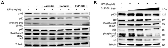Bioconversion of Citrus unshiu peel (CUP) suppresses nuclear factor (NF)-κB activation in Caco-2 cells. Immunoblotting analysis of canonical NF-κB proteins in whole-cell lysates of Caco-2 cells. Caco-2 cells were treated with hesperidin, narirutin (50 µg/mL), CUP extracted by ethanol (1 mg/mL) (A) and bioconversion of CUP (0, 100, 500, and 1000 mg/mL) (B) for 1 h, followed by stimulation with LPS (1 µg/mL) for 2 h. After stimulation, cells were harvested for immunoblotting.