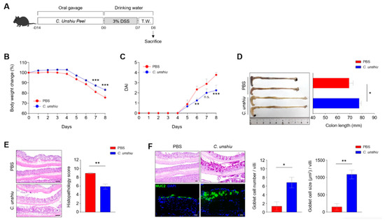 Citrus unshiu peel (CUP) ameliorates dextran sulfate sodium (DSS)-induced inflammation in vivo. (A) Scheme of the treatment with CUP and 3% DSS water in murine model. Body weight change (B) and fecal pathogenicity was monitored, and the disease activity index (DAI) (C) was evaluated for eight days during the induction of colitis. Representative image of the colon length (D; left) and its quantification bar graph (D) (right) with phosphate-buffered saline (PBS) and CUP-treated mice. The large intestine of the PBS- and CUP-treated mice were analyzed via hematoxylin and eosin (H&E) staining (E), periodic acid-Schiff (PAS) staining, and immunofluorescence (IF) staining for mucin 2 (MUC2) (F) and shown as representative images and quantification bar graphs. All data are represented as the mean ± standard error of the mean (SEM) of independent individuals. Statistical analyses were conducted using two-way analysis of variance (ANOVA) with Sidak’s multiple comparisons test for body weight change and DAI and the unpaired t-test for colon length and histology score. * p < 0.05, ** p < 0.01, and *** p < 0.001; n.s., not significant. Scale bar = 100 μm.