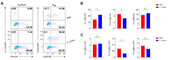 CUP decreases the frequency of T helper 17 (Th17) cells in the lamina propria of large intestine. (A) Representative images of the flow cytometry analysis of TH1 (CD45 + CD4 + IL17a-IFNγ+), Th17 (CD45 + CD4 + IL17a + IFNγ−), and Treg (CD45 + CD4 + CD25 + Foxp3+) cells in the lamina propria of large intestine. The summary graphs indicate the frequency (B) and absolute numbers (C) of immune cells (n = 3 per group). All data are represented as the mean ± SEM of independent experiments. Statistical analyses were conducted using unpaired t-tests. * p < 0.05; n.s., not significant.