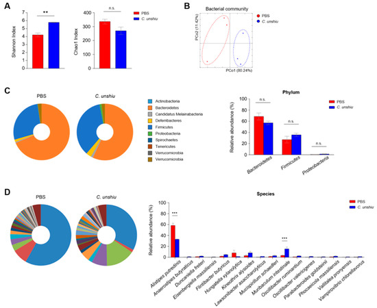 CUP alters the gut commensal microbiota. The community of microbiota in feces of PBS- and CUP-treated mice were analyzed via pyrosequencing. The bacterial composition was analyzed for alpha diversity ((A) Shannon and Chao1 index) and beta diversity ((B) principal coordinate analysis) between nontreated and treated groups. Representative pie charts (left) and relative abundance (right) of the commensal bacteria at the phylum (C) and species (D) levels. All data are represented as the mean ± SEM from three individual mice per group. The statistical analyses were conducted using an unpaired two-tailed t-test. ** p < 0.01 and *** p < 0.001; n.s., not significant.