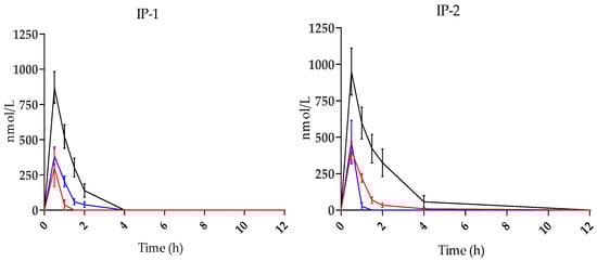 Mean plasma concentration profile of main HT metabolites before (0 h) and after intake of IP-1 (n = 12) and IP-2 (n = 13). HVA: black lines; HT-3-S: blue lines; DOPAC: red lines. Bars: SEM.