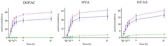 Comparing the kinetics of plasma concentration of the major metabolites (Figure 1) HVA peaks at 30 min and progressively decreases over the next 3.5 h; HT-3-S reached the maximum concentration 30 min after intake and strongly decreased within 2 h after administration. Of note, HVA and HT-3-S were measurable from 0.5 to 2 h at the lower HT dose and from 0.5 to 4 h at the higher dose. DOPAC showed the maximum concentration at 30 min after the intake of HT through the food supplements followed by a marked decrease until reaching values close to the LOQ one hour after ingestion.