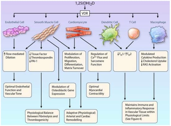 There is a growing body of evidence linking VDD to cardiovascular diseases []. For instance, VDD is associated with atherosclerosis, hypertension, cardiac hypertrophy, cerebrovascular diseases, coronary heart disease, and peripheral artery disease [], as well as with several cardiovascular risk factors, such as dyslipidemia, insulin resistance, diabetes mellitus, and abdominal obesity [,,]. VitD exerts a direct effect on the cardiovascular system, since VDRs have been found in cardiomyocytes [], vascular smooth muscle cells (VSMCs) [], endothelial cells [], circulating monocytes, macrophages, dendritic cells, activated T lymphocytes [], and platelets []. Furthermore, CYP27B1 (25-hydroxyvitamin D-1α-hydroxylase) is expressed in most of these cells, which enables the local synthesis of 1,25(OH)2D []. The cardiovascular protective effects of VitD include the modulation of immune, inflammatory, and endothelial functions []. Furthermore, VitD regulates cell proliferation and migration, renin expression, and extracellular matrix homeostasis, and it may attenuate the adverse effects of advanced glycation end products on endothelial cells [,]. In addition, VitD has an antithrombotic effect, since it downregulates the tissue factor, plasminogen activator inhibitor-1, and thrombospondin-1, whereas it upregulates thrombomodulin expression in monocytes and VSMCs [,]. Furthermore, VitD inhibits formation of foam cells and cholesterol uptake by macrophages; thus, it also exerts antiatherogenic effects []. Figure 2 summarizes the effects of VitD related to the cardiovascular system.