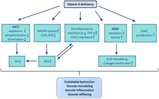 Representative actions of vitamin D deficiency in the (cerebro)vascular wall. Vitamin D deficiency impairs vascular functions via several pathways, including reductions in nitric oxide (NO) production, due to decreased endothelial nitric oxide synthase (eNOS) expression, phosphorylation, and dimerization. In addition, enhanced level of reactive oxygen species (ROS), resulting mainly from decreased expression of cytosolic copper-zinc superoxide dismutase (CuZn-SOD) and upregulation of the free radical generating nicotinamide adenine dinucleotide phosphate (NADPH) oxidase enzyme and its subunits in endothelial cells, contributes to endothelial dysfunction. Furthermore, vitamin D deficiency is associated with increased production of pro-inflammatory mediators, for instance, tumor necrosis factor-α (TNF-α) and cyclooxygenase 2 (COX-2), leading to vascular inflammation. Remodeling of extracellular matrix (ECM) and increased collagen–elastin ratio of vessel wall—particularly due to altered expression and activity of specific matrix metalloproteinases (MMPs)—as well as changes in vascular smooth muscle cell (VSMC) proliferation, may result in vascular remodeling and stiffening.
