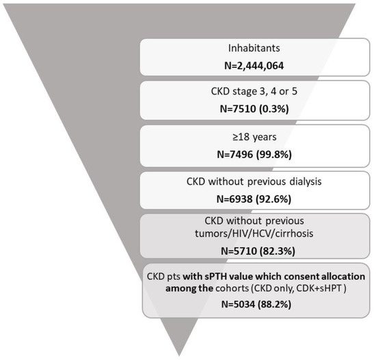 All patients were enrolled in the study if they presented at least one hospitalization with primary or secondary discharge diagnosis for CKD (any stage, 3–5) between 1 January 2012 and 31 March 2015 (enrolment period). The diagnosis was identified using ICD-9-CM codes: 585.3-585.4-585.5. The date of first diagnosis during this period was defined as the “CKD-index date”. Among patients identified, the presence of an sHPT diagnosis was ascertained during the first two years after the CKD-index date by at least one prescription of paricalcitol (ATC code: H05BX02) or calcitriol (ATC code: A11CC04), or a value of PTH ≥ 85 pg/mL, or at least one hospitalization with a discharge diagnosis of sHPT (ICD-9-CM: 252.0), or a payment waiver code for sHPT (026.252.0). Patients were excluded if they were under 18 years of age at the index date or if they had one of the following diagnoses at the CKD-index date or prior to their inclusion: dialysis, cancer, HIV, HCV, or cirrhosis. The included patients were assigned to one of two mutually exclusive cohorts: (1) the “CKD-only” cohort that included patients without sHPT diagnosis for whom the index date corresponded to the CKD-index date or (2) the “CKD + sHPT” cohort including CKD patients with sHPT diagnosis for whom the index date was set at the first match with the sHPT criteria. The patients were characterized during all data availability periods before the index date (characterization period) and the follow-up from the index date until 31 July 2020 (follow-up period).