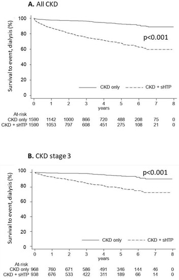 Kaplan-Meier curves for the CKD + sHPT vs. CKD only groups showing survival to the event (dialysis) in all CKD patients (A) and in those with CKD stage 3 (B).