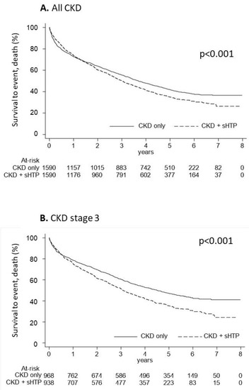 Kaplan-Meier curves for the CKD + sHPT vs. CKD-only groups showing overall survival in all CKD patients (A) and in those with CKD stage 3 (B).