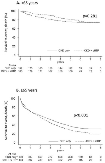 In Figure 5, the overall survival of CKD and CKD + sHPT patients under and over 65 years old is reported. In patients under 65 years old, the Kaplan-Meier curves showed that overall survival was comparable (p = 0.281) among the CKD + sHPT versus CKD-only group (incidence rate: 42.96 in CKD + sHPT and 53.34 in CKD patients) (Figure 5A). In patients ≥65 years old, the Kaplan-Meier curves showed that overall survival was significantly lower (p < 0.001) in the CKD + sHPT versus CKD-only group (incidence rate: 259.53 in CKD + sHPT and 206.44 in CKD patients) (Figure 5B).
