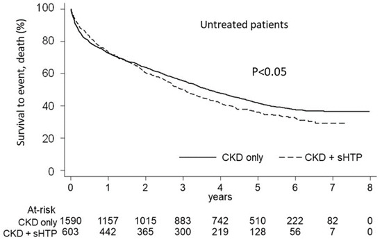 As Figure 6 shows, in the untreated patients, the Kaplan-Meier curves for cumulative mortality revealed a lower survival in the CKD + sHPT versus CKD-only group (p < 0.05), with an incidence death rate higher in the CKD + sHPT vs. CKD-only patients (215.96 vs. 180.04, respectively).