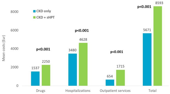 The estimation of overall direct healthcare costs during the one-year follow-up (index-date excluded) is reported in Figure 7. The overall mean cost/patient was significantly higher in the CKD + sHPT versus CKD patients without sHPT (EUR 8593 vs. EUR 5671, p < 0.001), and this phenomenon derived from higher expenditures related to drugs (EUR 2250 vs. EUR 1537, p < 0.001), hospitalizations (EUR 4628 vs. EUR 3479, p < 0.001), and outpatient services (EUR 1715 vs. EUR 654, p < 0.001) for the management of CKD + sHPT patients with respect to those without sHPT (Figure 7).