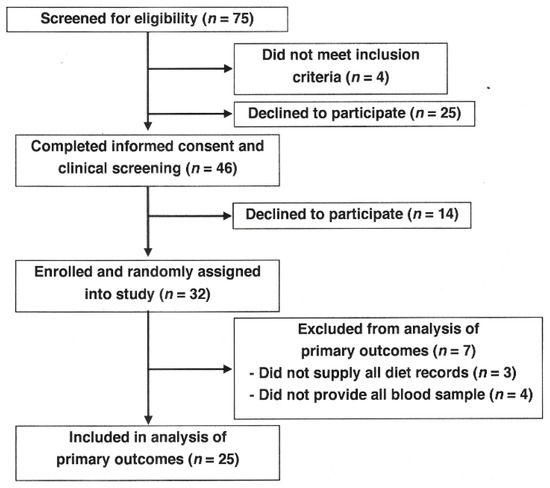 Seventy-five healthy males between the ages of 25 and 60 years participated in one of two informational meetings (Figure 1). Four individuals did not meet the inclusion criteria, and 25 men declined to participate. Forty-six men signed Informed Consent forms, and 14 men later declined to participate. Thirty-two men were assigned at random to two treatment groups, LF and HF ground beef, and were provided test ground beef patties. Seven men who left the study were excluded due to inability to comply (did not provide all diet records, n = 3; did not provide all blood samples, n = 4), and 25 men completed all phases of the study.