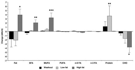 Absolute change (final – entry) in %MJ/d during consumption of ground beef patties initially containing 6 g fat/patty (Low fat) and 27 g fat/patty (High fat). Fat, total fat; SFA, saturated fat; MUFA, monounsaturated fat; PUFA, polyunsaturated fat; CHO, carbohydrate. Bars are means (n = 25) with pooled SEM attached. Change statistically different from 0, * p ≤ 0.05; ** p ≤ 0.01; *** p ≤ 0.001.