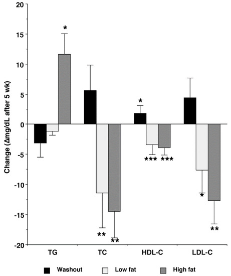 Plasma TG concentration tended (p = 0.058) to be greatest following the HF treatment (Table 4). The LF treatment decreased TC, HDL-C, and LDL-C concentrations relative to entry, and the HF treatment decreased TC, HDL-C, and LDL-C concentrations relative to entry and washout. Absolute changes from entry were significant (p < 0.05) for TC and HDL-C following the LF treatment, and absolute changes from entry were significant (p < 0.05) for TG, TC, HDL-C, and LDL-C following the HF treatment (Figure 4).