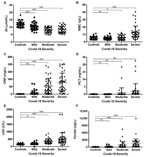 Serum zinc and inflammatory marker levels in controls and COVID-19 patients. Blood from controls (n = 48), mild (n = 42), moderate (n = 41), and severe (n = 40) COVID-19 subjects was used to assess zinc (A), WBC (B), CRP (C), PCT (D), LDH (E), and ferritin (F) levels. Values are plotted as replicates (mean ± SD). * p < 0.05, ** p < 0.01, and *** p < 0.001. ns, not significant.