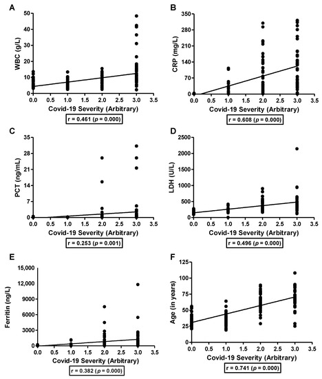 Association of inflammatory markers with the severity of COVID-19 infection. Severity of COVID-19 infection was used to study the association with WBC (A), CRP (B), PCT (C), LDH (D), ferritin (E), and age (F). Correlation was analyzed by Pearson correlation analysis.