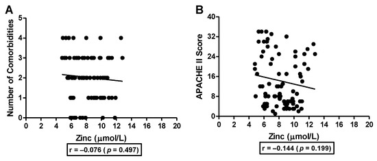 Association of number of comorbidities and APACHE II scores with serum zinc levels in hospitalized COVID-19 subjects. Number of comorbidities (A) and APACHE II score (B) were used to study the association with serum zinc levels in moderate and severe COVID-19 subjects admitted to either the hospital wards or ICU, respectively. Correlation was analyzed by Pearson correlation analysis.