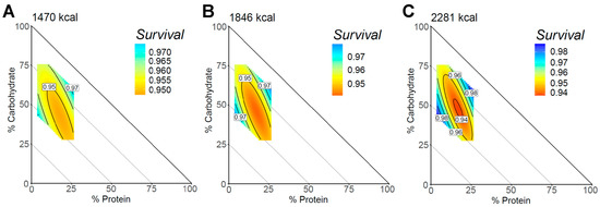 Macronutrient composition with all-cause mortality. The mixture triangle shows the model predictions of the all-cause mortality survival score for the range of macronutrient percentages in this dataset. (A–C) The predictions using the 25th, 50th, and 75th percentiles of caloric intake for the study population. The x and y-axes show protein and carbohydrate levels, respectively. Percentage of fat can be inferred as decreasing and moving away from the origin such that each point on the triangle can be summed to equal 100%. Response values are colored such that warm colors show a higher risk of mortality and cooler colors show a lower mortality risk. Response surfaces were adjusted for age, sex, household income, BMI, physical activity, and Healthy Eating Index.