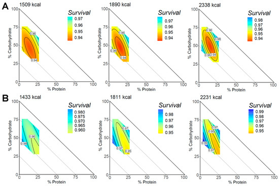 Associations of macronutrient composition with all-cause mortality for males and females. The mixture triangle shows the model predictions of the all-cause mortality survival score for the range of macronutrient percentages in this dataset. (A) The predictions using the 25th, 50th, and 75th percentiles of caloric intake for males, and (B) shows this for females. The x and y-axes show protein and carbohydrate levels, respectively. Percentage of fat can be inferred as decreasing and moving away from the origin such that each point on the triangle can be summed to equal 100%. Response values are colored such that warm colors show a higher risk of mortality and cooler colors show a lower mortality risk. Response surfaces were adjusted for age, sex, household income, BMI, physical activity, and Healthy Eating Index.