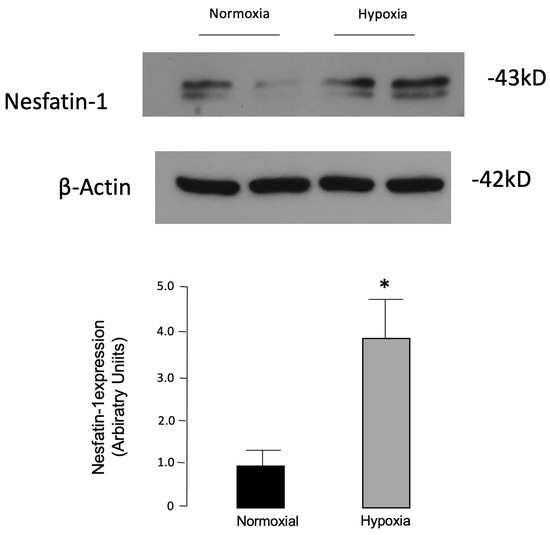 Effects of hypoxia on nesfatin-1 protein expression in murine 3T3-L1 adipocytes. Fully differentiated 3T3-L1 adipocytes were incubated under hypoxic conditions (2% O2) for 24 h maintained in normoxia (21% O2). Western blot analysis was performed with 3L3-L1 protein extracts using an anti-nesfatin antibody. Beta-actin antibody served as the protein loading control. Representative WBs of three separate experiments and mean densitometric analyses of WBs performed in 3T3-L1 cells under different oxygen tension are shown. * p < 0.003 vs. normoxia (Student’s t-test).