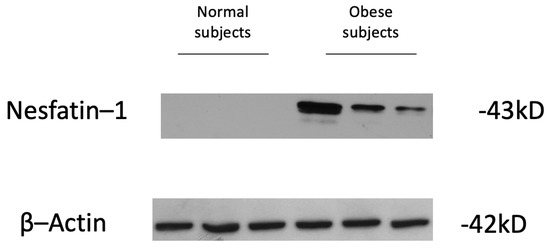 To investigate whether human adipose tissue indeed produces nesfatin-1, and to clarify whether this protein is more abundant in obese vs. non-obese subjects, protein extracts from omental VAT of obese and normal-weight patients were analyzed by Western blot analysis. Nesfatin-1 was searched in human VAT from controls (n = 6; mean BMI = 23.6 ± 1.5 kg/m2) and obese patients (n = 11; mean BMI = 45.8 ± 6.1 kg/m2). Our data showed that nesfatin-1 was undetectable in the VAT of normal-weight individuals, while a significant amount of this protein was observed in all (n = 11) obese patients (Figure 2), reinforcing the concept that nesfatin-1 may be differentially produced in adipose tissue in relation to patients’ BMI.