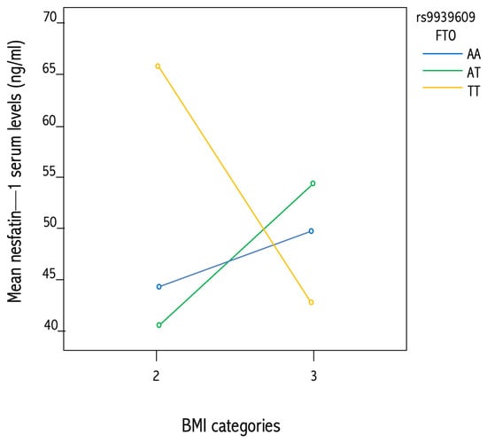 The genetic analysis for FTO rs9939609 polymorphisms showed that the AT genotype was the most frequent. GLM analysis demonstrated that a significant effect of the interaction between FTO × BMI emerged (F = 4.935; p = 0.018) on nesfatin-1 plasma levels (Table 6; Figure 4).