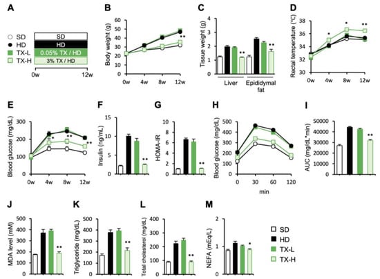 To test the therapeutic potentials of Taxifolin in obesity, different doses of Taxifolin were orally administered to male C57BL6/J mice fed an HD for 12 weeks (Figure 1A). Taxifolin treatment dose-dependently suppressed the increase in body weight and liver and epididymal fat weights (Figure 1B,C). The mice fed an HD containing high-dose Taxifolin (TX-H) had a significantly increased rectal temperature relative to those fed a control HD (Figure 1D), although there was no significant difference in the food intake between the treatments. For the metabolic parameters, the blood glucose concentrations under fasted conditions were significantly lower in the TX-H group than in the HD group (Figure 1E). The serum insulin concentrations and HOMA-IR were also suppressed in the TX-H group (Figure 1F,G). The intraperitoneal glucose tolerance test confirmed the ameliorated glucose metabolism by Taxifolin treatment (Figure 1H,I). As it is known as an antioxidant, the Taxifolin treatment significantly reduced the serum MDA concentrations in the diet-induced obese mice (Figure 1J). In addition, the serum levels of triglyceride, total cholesterol, and NEFA were significantly lower in the TX-H group than in the HD group (Figure 1K–M).