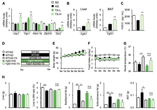 Regarding the increased rectal temperature in the TX-H group, we found that the Taxifolin treatment increased the mRNA expression of genes related to brown adipose tissue activation such as uncoupling protein-1 (Ucp1) in brown adipose tissue (Figure 3A). Brown adipose tissue is involved in nonshivering thermogenesis during cold exposure and diet-induced thermogenesis, thereby contributing to whole-body energy expenditure []. Of note, the mRNA expression of Fgf21, a potent inducer of thermogenic genes in brown adipose tissue, was increased in the liver and brown adipose tissue by the Taxifolin treatment (Figure 3B). In line with this, Taxifolin treatment effectively restored the otherwise reduced serum Fgf21 concentrations in the diet-induced obese mice (Figure 3C). These observations led us to examine the involvement of Fgf21 in the Taxifolin-mediated anti-obesity effects. In this study, high-dose Taxifolin was orally administered to Fgf21-deficient and wild-type mice fed an HD for 6 weeks (Figure 3D). The suppressive effects of Taxifolin on body weight, adipose tissue weights, and rectal temperature were partially reduced in the Fgf21-deficient mice, whereas the treatment did not affect food intake (Figure 3E–H). These findings suggest that Taxifolin potently suppresses the development of obesity, at least partly, through Fgf21 production.