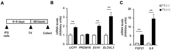 Direct action of Taxifolin on brown adipocytes: (A) experimental protocol: human iPS cell-derived brown adipocytes (hiPSCdBAs) were differentiated and then treated with Taxifolin at 100 μM for 48 h; (B) expression levels of genes related to brown adipocyte markers (UCP1, PRDM16, EVA1, and ELOVL3); (C) expression levels of FGF21 and IL6 mRNAs in the hiPSCdBAs. Values are presented as the means ± SEM; n = 3; significant differences: ** p < 0.05 vs. hiPSCdBAs without Taxifolin treatment.