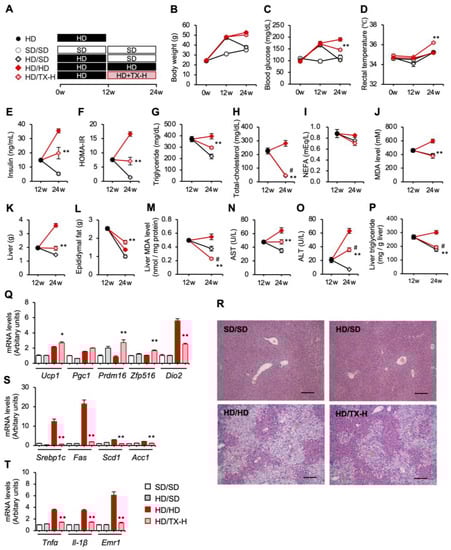 Therapeutic effects of Taxifolin on hepatic steatosis in diet-induced obese mice. (A) Experimental protocol: after being fed an HD for 12 weeks, C57BL/6J mice were divided into the following 3 groups and then fed the respective diets for an additional 12 weeks—HD/SD group with an SD, HD/HD group with an HD, and HD/TX-H group with an HD containing 3% (wt/wt) Taxifolin. The mice were also fed an HD for 12 weeks as the pretreatment HD group and an SD for 24 weeks as the control SD/SD group. n = 6 in each group. (B–D) Time course of body weight (B), fasting blood glucose levels (C), and rectal temperature (D). E-P: Metabolic parameters and tissue weights of the HD, HD/SD, HD/HD, and HD/TX-H groups. Serum concentrations of insulin (E), triglyceride (G), total cholesterol (H), NEFA (I), MDA (J), AST (N), and ALT (O). (F) HOMA-IR. Liver (K) and epididymal fat (L) tissue weights. Hepatic MDA (M) and triglyceride (P) contents. (Q–T) Four groups: white square, SD/SD; gray square, HD/SD; dark-red square, TX-L; light-red square: TX-H. (Q) Expression levels of genes related to brown adipocyte markers (Ucp1, Pgc1, Prdm16, Zfp516, and Dio2) in the interscapular brown adipose tissue. (R) HE staining of the liver. Scale bars: 200 µm. (S,T) Expression levels of genes related to lipogenesis (Srebp1c, Fas, Scd1, and Acc1) and inflammation (Tnfα, Il1b, and Emr1 (F4/80)) in the liver. Values are presented as the means ± SEM; n = 6; significant differences: * p < 0.05 and ** p < 0.01 vs. HD/HD; # p < 0.05 vs. HD.