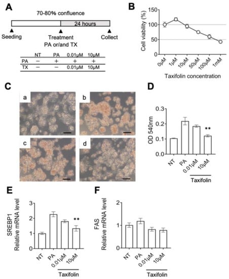 The human hepatocellular carcinoma cell line, HepG2, was purchased from the American Type Culture Collection (Manassas, VA). HepG2 was cultured in high-glucose Dulbecco’s modified Eagle’s medium (DMEM) supplemented with 10% fetal bovine serum (BSA), 100 U/mL penicillin, and 100 μg/mL streptomycin and incubated in 5% CO2 at 37 °C. The effects of Taxifolin on cell viability were evaluated using the 3-(4,5-dimethylthiazol-2-yl)-2,5-diphenyl tetrazolium bromide (MTT) assay according to the manufacturer’s instructions (Nacalai Tesque). The administration of palmitic acid (PA) was conducted as previously described with minor modifications. []. The PA (Sigma-Aldrich) was solubilized in ethanol until the PA particles were completely dissolved. Then, the PA was combined with fatty-acid-free BSA solution at a volume ratio of 10:1 (BSA sol.: PA sol.) immediately and with sufficient mixing at 37 °C. A control solution containing ethanol and BSA was prepared similarly. The HepG2 cells were treated with PA at 400 µM for 24 h. The lipid accumulation of the HepG2 cells were also assessed by Oil Red O staining. Briefly, the HepG2 cells were with PBS, fixed in formalin (10%) for 1 h, stained with Oil Red O solution for 1 h, and washed with distilled water. To quantitate the lipid contents, Oil Red O was extracted from each well with isopropanol and read spectophotometrically at 540 nm.