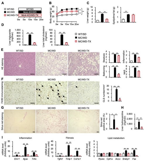 Preventive effects of Taxifolin on the development of NASH in a mouse model. (A) Experimental protocol: genetically obese melanocotin-4 receptor (Mc4r)-deficient mice on a WD with or without 3% Taxifolin for 20 weeks (MC/WD or MC/WD-TX, respectively). Wild-type mice on a standard diet for 20 weeks (WT/SD) were used as a control. (B) Growth curve: C-I 3 groups–white square, WT/SD; black square, MC/WD; light-red square, MC/WD-TX. (C) Liver and epididymal fat weights. (D) Hepatic triglyceride and total cholesterol contents. (E) HE staining of the liver. Histological analysis using the nonalcoholic fatty liver disease (NAFLD) activity score (NAS) system. (F) F4/80 immunostaining. The arrows indicate the crown-like structures (CLS). (G) Sirius red staining. (H) Hydroxyproline contents of the liver. (I) Expression levels of genes related to inflammation (Emr1, Itgax, and Tnfα), fibrosis (Tgfb1, Timp1, and Col1a1), and lipid metabolism (Ppara, Cpt1a, Acox, Srebp1, and Fas). Scale bars: 100 µm. Values are presented as the means ± SEM; n = 11–12; significant differences: * p < 0.05 and ** p < 0.01.