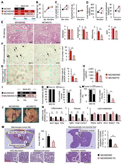Therapeutic effects of Taxifolin on the progression of NASH in a mouse model. (A) Experimental protocol: the Mc4r-deficient mice were on a WD for 16 weeks to develop NASH and then treated with or without 3% Taxifolin for an additional 8 weeks (MC/WD/WD or MC/WD/TX, respectively). (B) Growth curve; (C) liver and epididymal fat weights; (D) hepatic triglyceride and total cholesterol contents. (E–H) Two groups: dark-red square, MC/WD/WD; light-red square, MC/WD/WD-TX. (E) HE staining of the liver. Histological analysis using the NAS. Scale bars: 100 µm. (F) F4/80 immunostaining of the liver. The arrows indicate the CLS. (G) Immunostaining for collagen type III of the liver. (H) Hydroxyproline contents of the liver. Scale bars: 100 µm; n = 10–11; * p < 0.05 and ** p < 0.01. (I) experimental protocol: the Mc4r-deficient mice were fed a WD for 20 weeks to develop NASH and then treated with or without 3% Taxifolin for an additional 30 weeks (MC/WD/WD or MC/WD/TX, respectively). (J) Representative image of the gross appearance of the livers. (K–M) Two groups: black square, MC/WD/WD; light-red square, MC/WD/WD-TX. (K,L) Incidence and multiplicity of foci (K) and tumors (L) in the liver. (M) Representative images of the HE staining of the macroscopic tumoral (left) and nontumoral (right) lesions. The areas defined by yellow and red lines indicate a grossly detectable tumor and an HCC-like lesion that can only be detected by histological examination, respectively. a–c: A higher magnification view of the HCC-like lesion (a), background tumor (b), and dysplastic nodule (c). (N): Expression levels of genes related to inflammation (Emr1, Itgax, and Tnfα), fibrosis (Tgfb1, Timp1, and Col1a1), and lipid metabolism (Pparα, Cpt1a, Acox, Srebp1, and Fas) in nontumorous lesions of the liver. Values are presented as the means ± SEM; n = 13 and 12, for MC/WD/WD and MC/WD/TX, respectively; significant differences: ** p < 0.01.