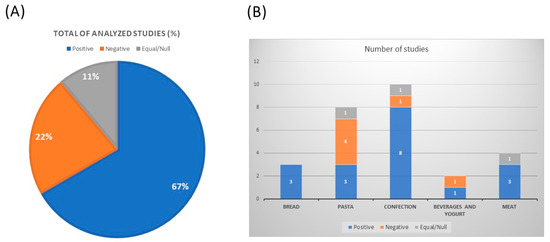Figure 1. Sensorial analysis of functional food products developed by incorporation of underutilized grains. (A) Percentage of the analyzed studies. A total of 27 studies that evaluated the sensorial analysis of developed products were summarized in this section of the review from the literature search (PubMed and Web of Science). The reported sensory attributes were categorized as positive, negative, or null outputs in the final formulation. (B) Classification of the resulting sensorial attributes in each food group including bread, pasta, confectionary, meat, beverages, and yogurt.