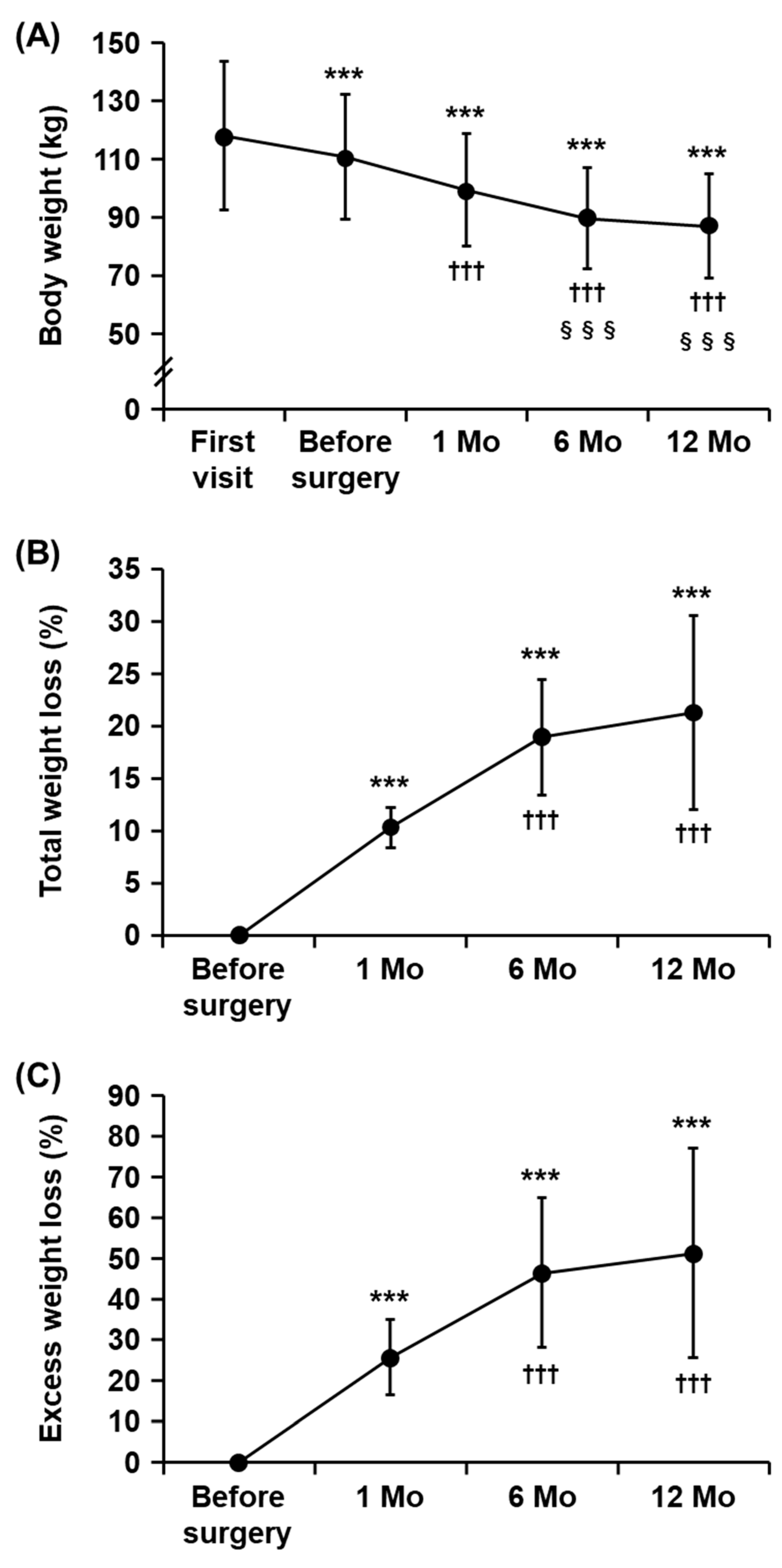 3.1. Characteristics of the Study Subjects and Changes in Body Weight after Metabolic and Bariatric Surgery