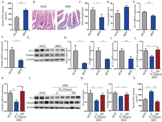 3.1. HFD-Induced Intestinal Epithelial Barrier Destruction Was Associated with the Down-Expression of IL-22