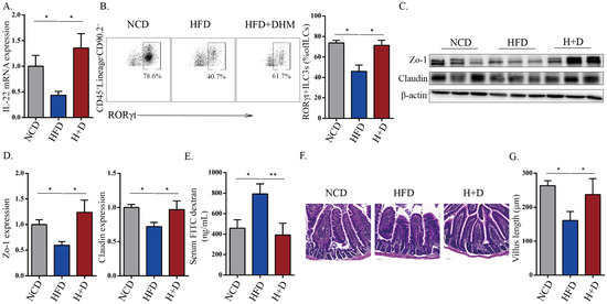 3.2. DHM Protected against HFD-Induced Intestinal Barrier Destruction That Was Associated with Increased IL-22 and ILC3 Frequency