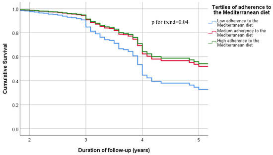 Cumulative Survival Curves from Cox analysis for depression incidence according to the tertiles of adherence to the Mediterranean diet. The models are adjusted for age, sex, years of education and baseline Global Cognition Score.