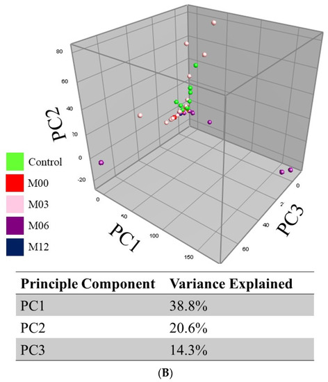 Unsupervised partitioning of gut microbiomes of healthy controls and surgery patients before surgery, 3 months, 6 months, and 1 year after surgery. Data were analyzed using hierarchical clustering (A) and principal component analysis (B). M00: pre-surgery; M03: 3 months post-surgery; M06: 6 months post-surgery; M12: 12 months post-surgery.